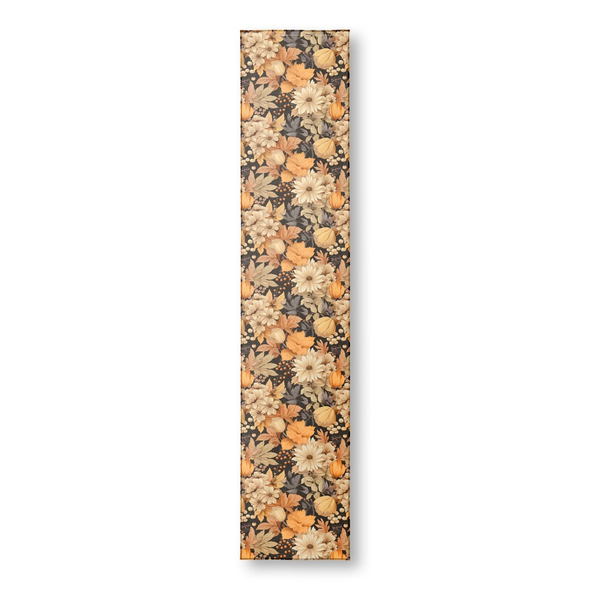 This is a seamless botanical pattern featuring autumn flora. A warm palette of orange, cream, and muted tones for flowers, leaves, and berries is set against a dark background, creating a rich, elegant, and vintage-inspired design with a cozy, autumnal feel.