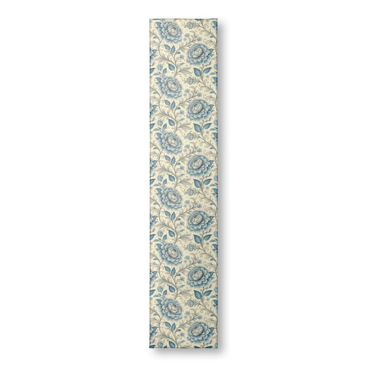 An elegant, traditional floral pattern featuring large, detailed blue and cream peonies. The flowers are interwoven with scrolling grey and blue vines on a dotted, pale yellow background, creating a sophisticated, vintage-inspired design suitable for textiles or wallpaper.