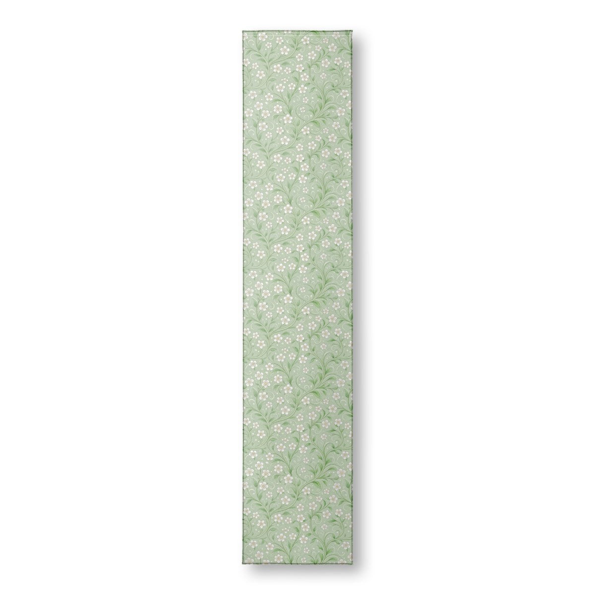A vintage-style seamless pattern featuring delicate white flowers on gracefully swirling green vines. The intricate, elegant design is set against a soft, muted sage green background with subtle decorative swirls, creating a classic and serene composition.