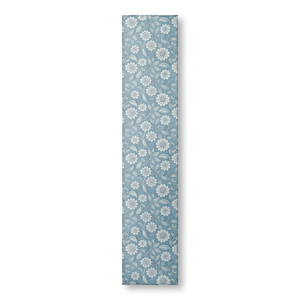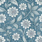 This is a seamless, monochromatic floral pattern featuring stylized white and gray flowers with swirling stems and leaves. Set against a textured, muted blue background, the elegant design has an intricate, embossed quality, giving it a vintage, decorative appearance.