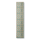 A vibrant, bohemian tile pattern features intricate sun and floral mandalas. The detailed orange, cream, and beige motifs are set within ornate diamond shapes on a rich teal background, creating a decorative, folk-art feel.