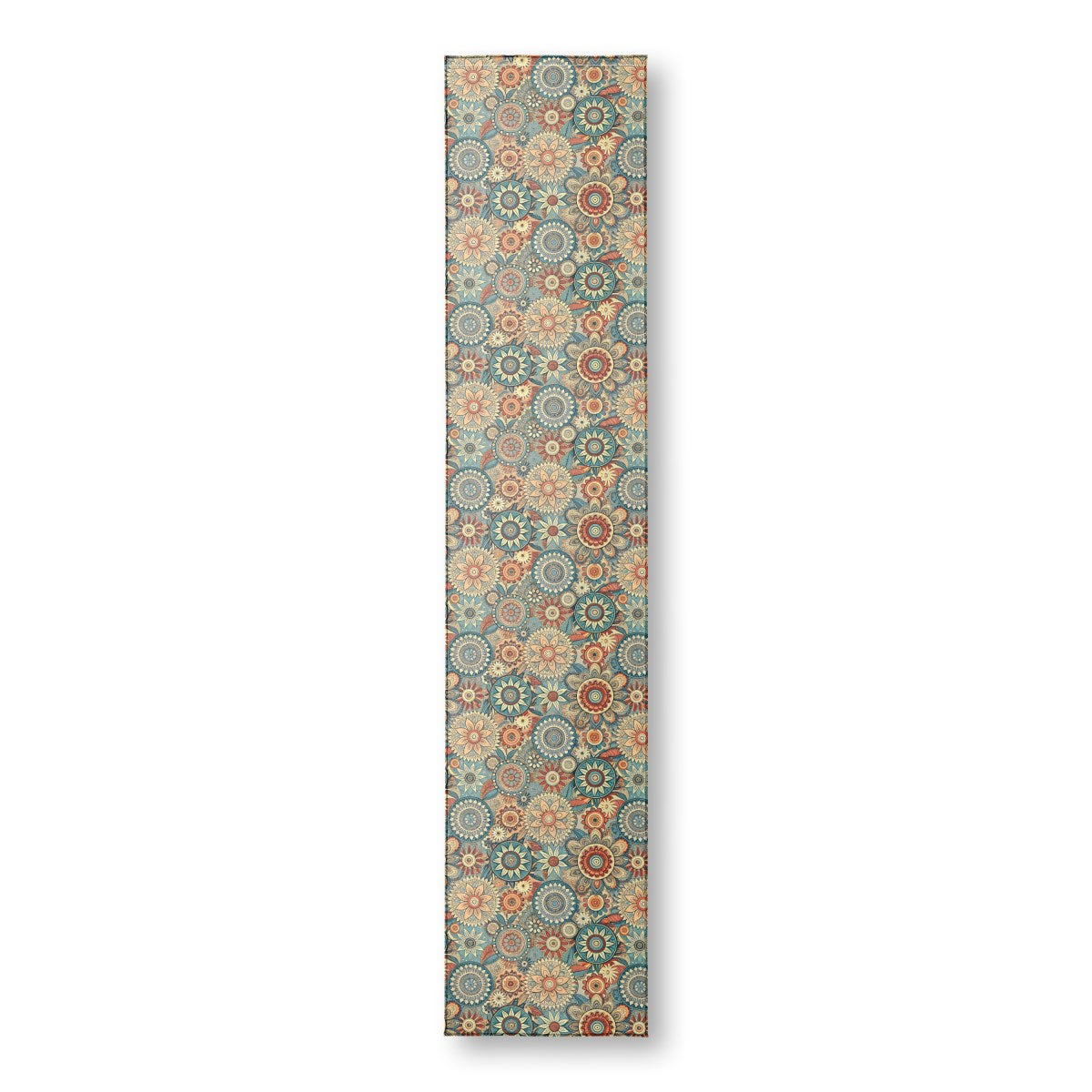 A dense, bohemian-style pattern of intricate, hand-drawn mandalas and stylized flowers. The collage-like design uses an earthy color palette of teal, orange, and cream, creating a vintage, folk-art feel.