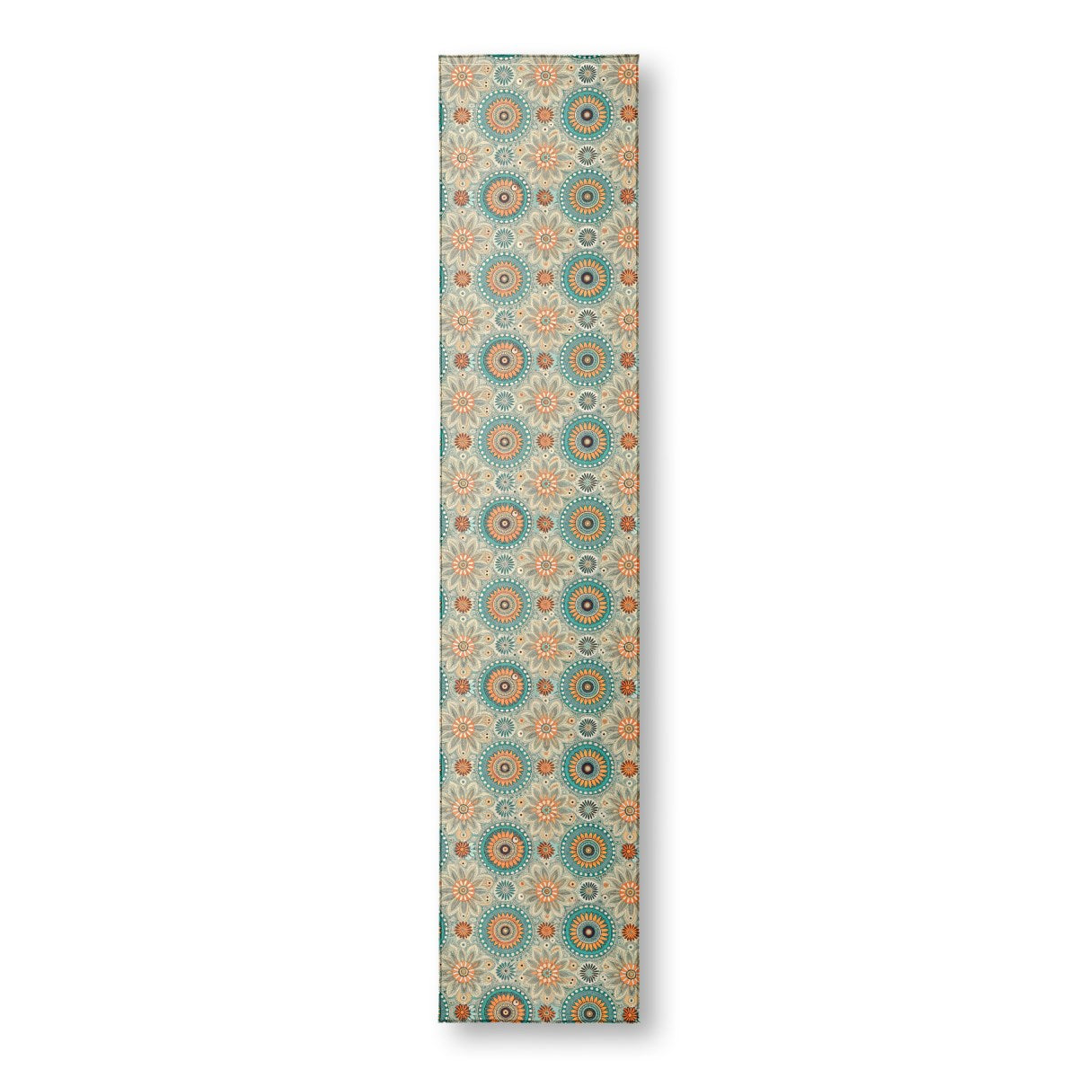 This is a vibrant, repeating pattern featuring intricate mandalas and stylized flowers in a bohemian, folk-art style. The design uses a striking color palette of teal, orange, and cream, with detailed line work and dotted textures creating a rich, layered effect.