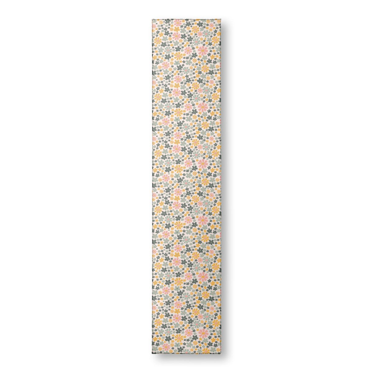 A retro-inspired, seamless pattern of stylized flowers. The ditsy floral print uses a muted color palette of pink, mustard yellow, sage, and dark green against a cream background, creating a groovy, 1970s aesthetic.