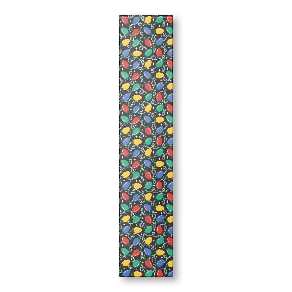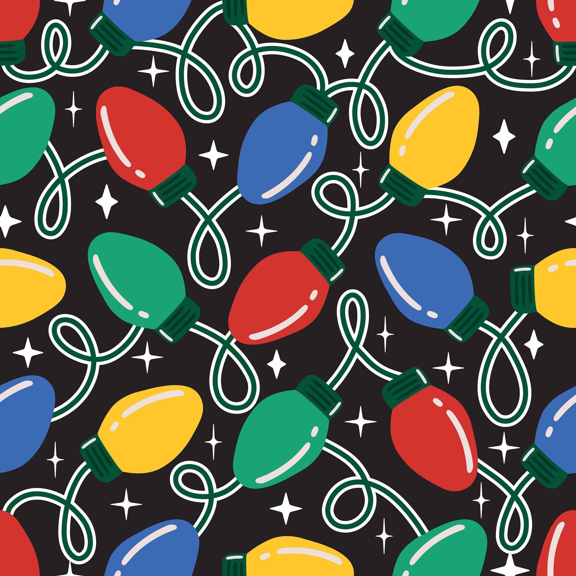 A festive, repeating pattern of colorful Christmas lights. The red, blue, green, and yellow bulbs are strung on looping white wires against a black background. White sparkles add a touch of magic to the cheerful, retro-style holiday design.
