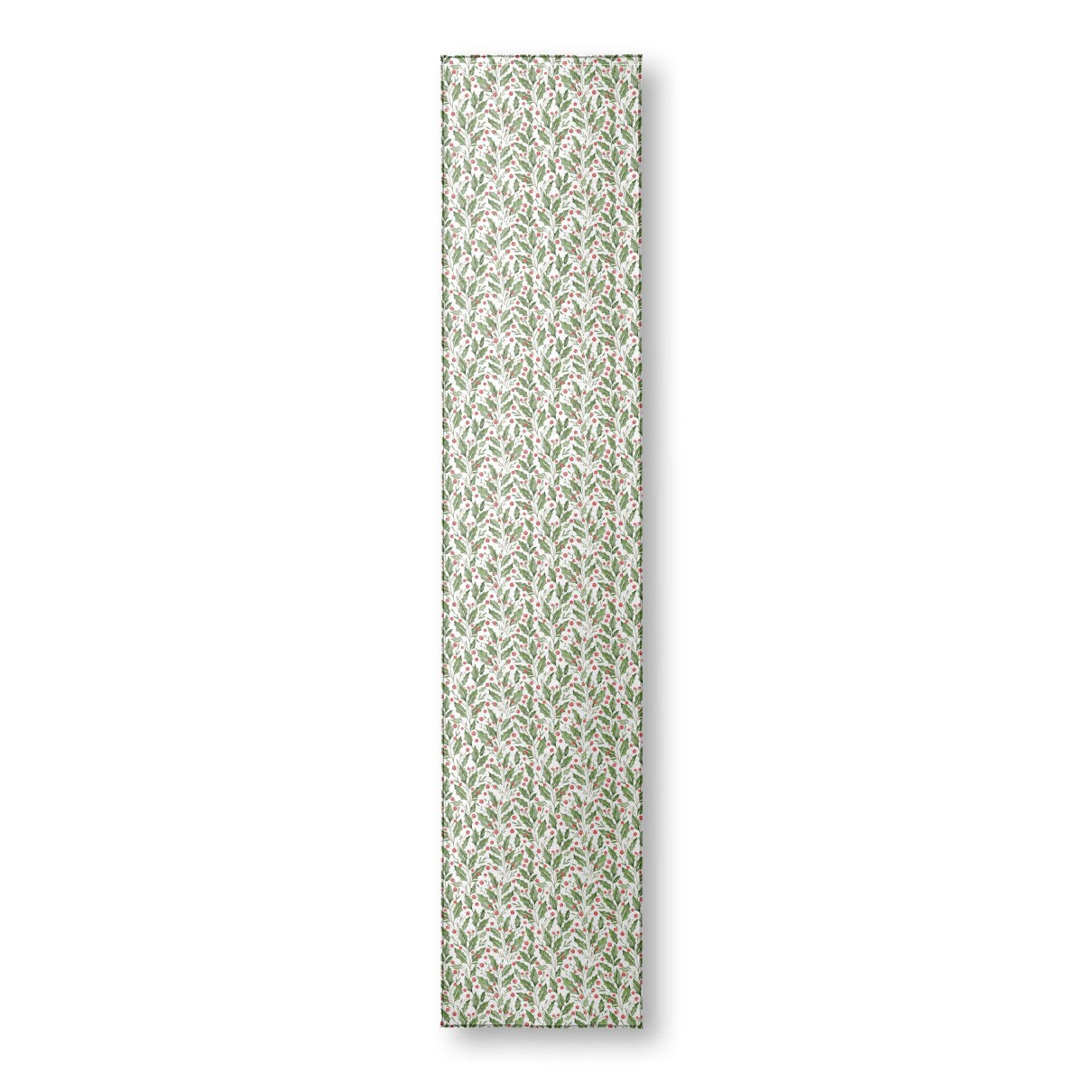 This is a seamless watercolor pattern of festive holly. Spiky green leaves and bright red berries are arranged in vertical sprigs against a white background, creating a classic and cheerful Christmas design.