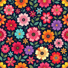 A vibrant, seamless pattern of stylized, colorful flowers in shades of pink, red, orange, and purple. The cheerful blossoms and green leaves pop against a dark navy-blue background, creating a dense and lively folk-art-inspired design.