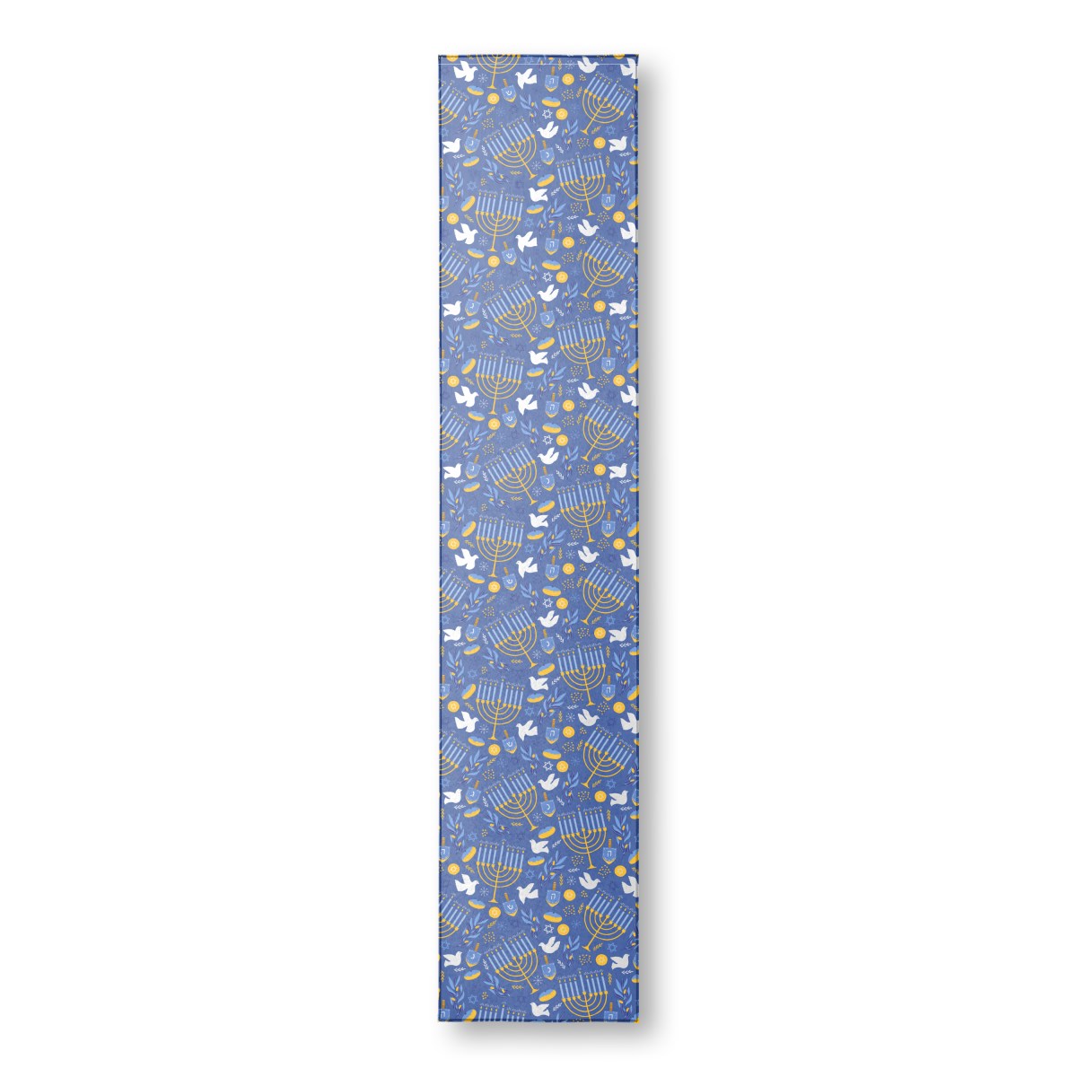A festive, repeating pattern celebrating Hanukkah on a blue background. The design features illustrations of menorahs, dreidels, sufganiyot (doughnuts), Stars of David, and white doves in a cheerful yellow, blue, and white color palette, creating a joyful holiday theme.