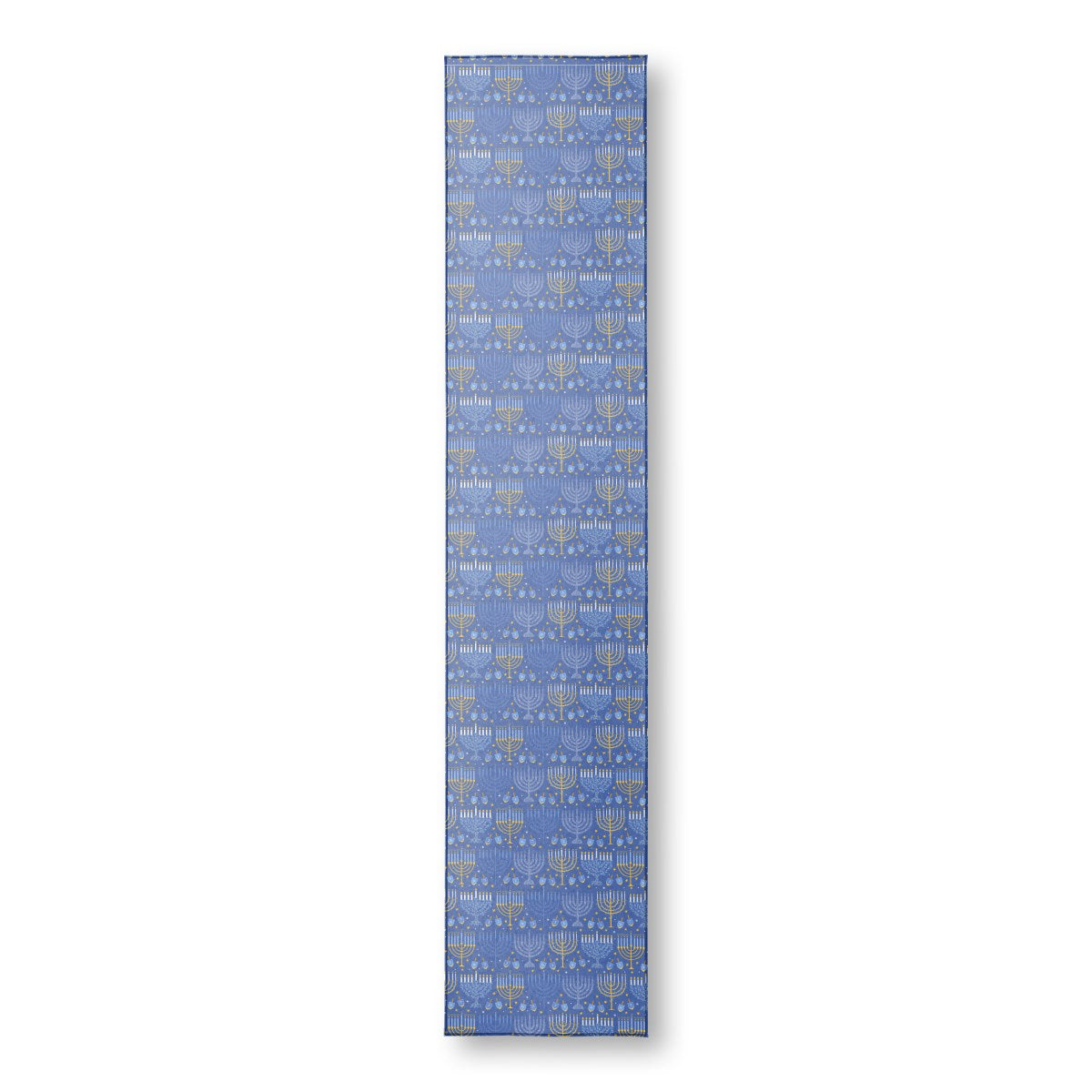 This is a festive, repeating Hanukkah pattern on a blue background. The illustration features various stylized menorahs, dreidels, lit candles, and stars in a cheerful color palette of blue, yellow, and white, celebrating the Jewish holiday.