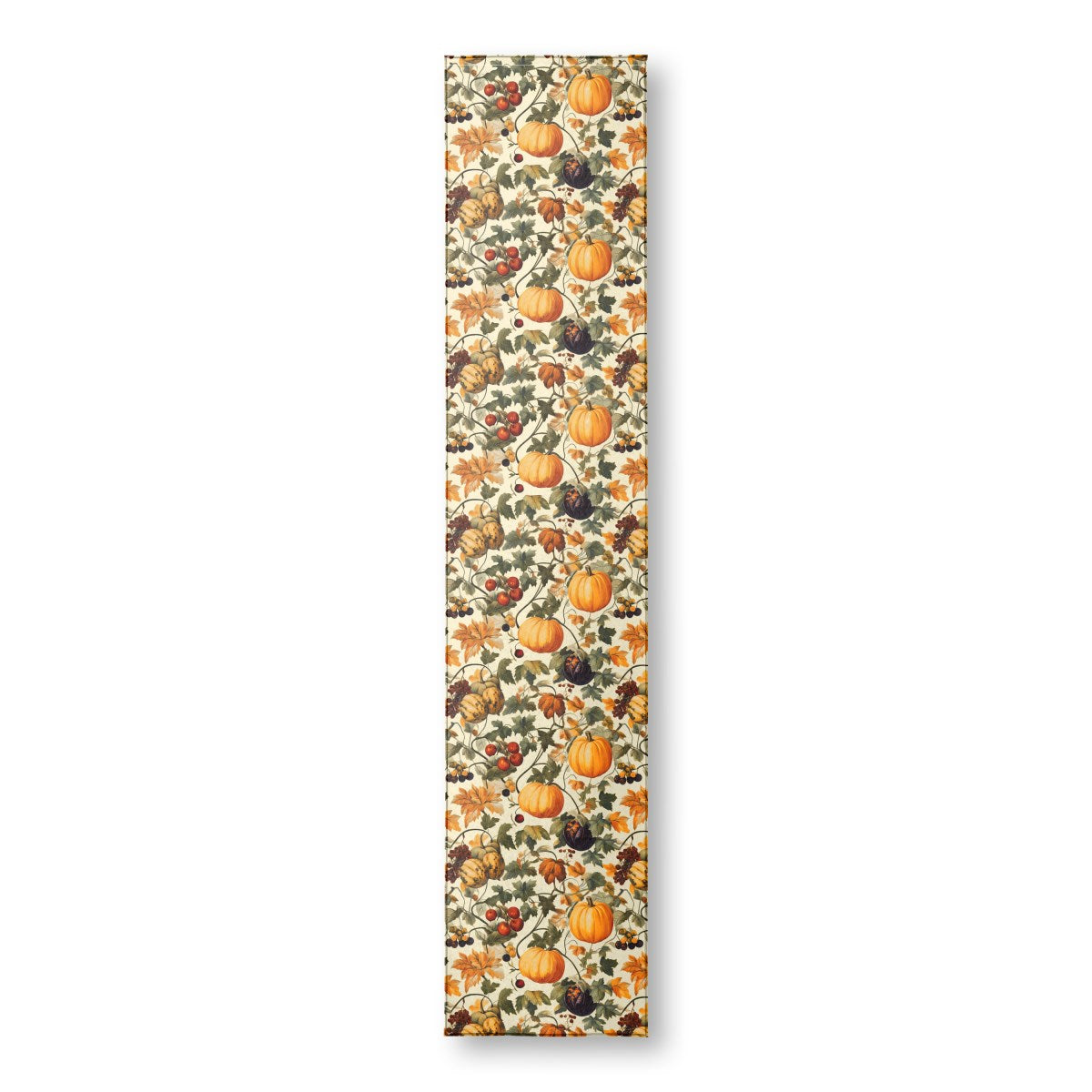 A vintage-style pattern illustrates a bountiful autumn harvest. Orange pumpkins, mottled gourds, grapes, and berries are interwoven with colorful fall leaves and twisting vines against a cream background, evoking a sense of seasonal abundance.
