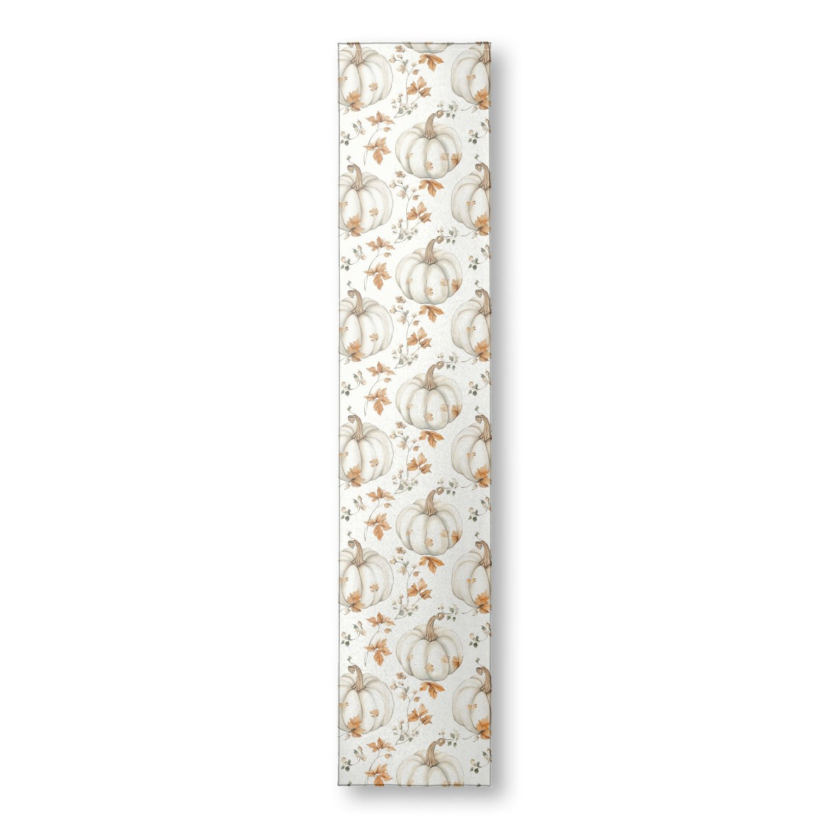 This is a delicate watercolor pattern featuring elegant white pumpkins. The design is interspersed with rustic brown autumn leaves, small white flowers, and trailing vines on a clean background, creating a soft and sophisticated fall aesthetic.