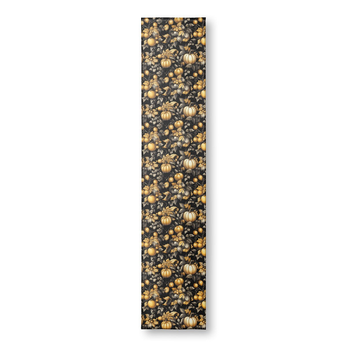 A luxurious, vintage-style pattern of autumnal fruits and foliage. Rendered in a detailed engraving style, golden pumpkins, apples, and grapes contrast richly with silver-toned leaves against a dramatic black background, creating an opulent and seamless design.