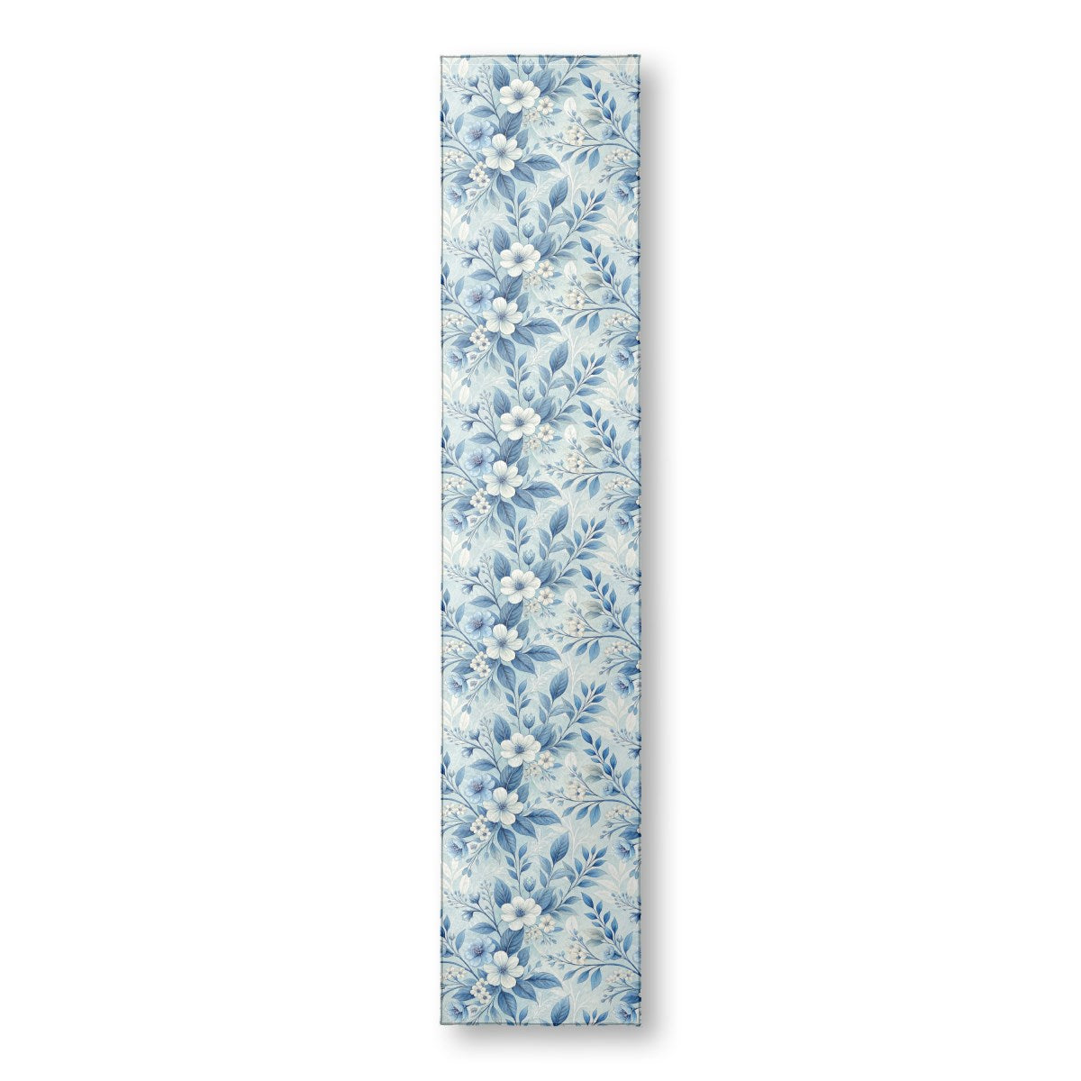 An elegant floral pattern featuring intricate white and blue blossoms with deep blue leaves. The delicate arrangement is set against a soft, textured, light blue background, creating a serene and classic design with a watercolor-like feel.