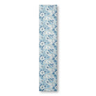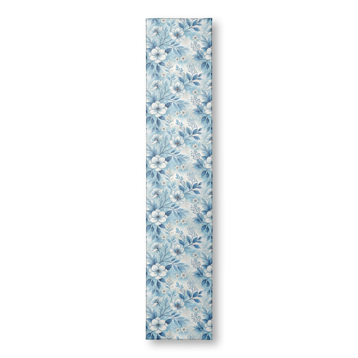 This watercolor illustration depicts a delicate floral pattern. White flowers with dark centers and deep blue leaves are intertwined on winding stems. The composition is set against a soft, mottled light blue background, creating a serene and elegant design.