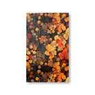 A vibrant, stylized botanical pattern features glowing leaves and berries in warm autumnal shades of orange, red, and yellow. The elegant, swirling elements are set against a dark background, creating a rich and dynamic composition with a painterly feel.