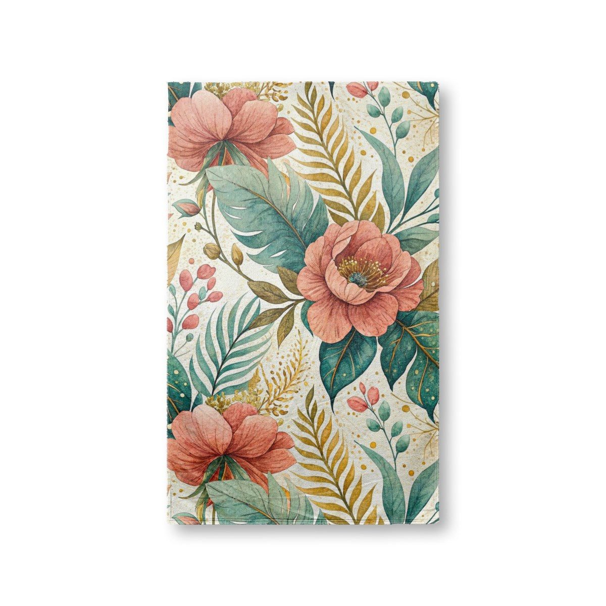 A watercolor-style botanical pattern featuring large, dusty rose flowers and lush tropical leaves in shades of teal, green, and gold. The elegant design is set on a cream background accented with golden speckles, creating a warm and artistic feel.