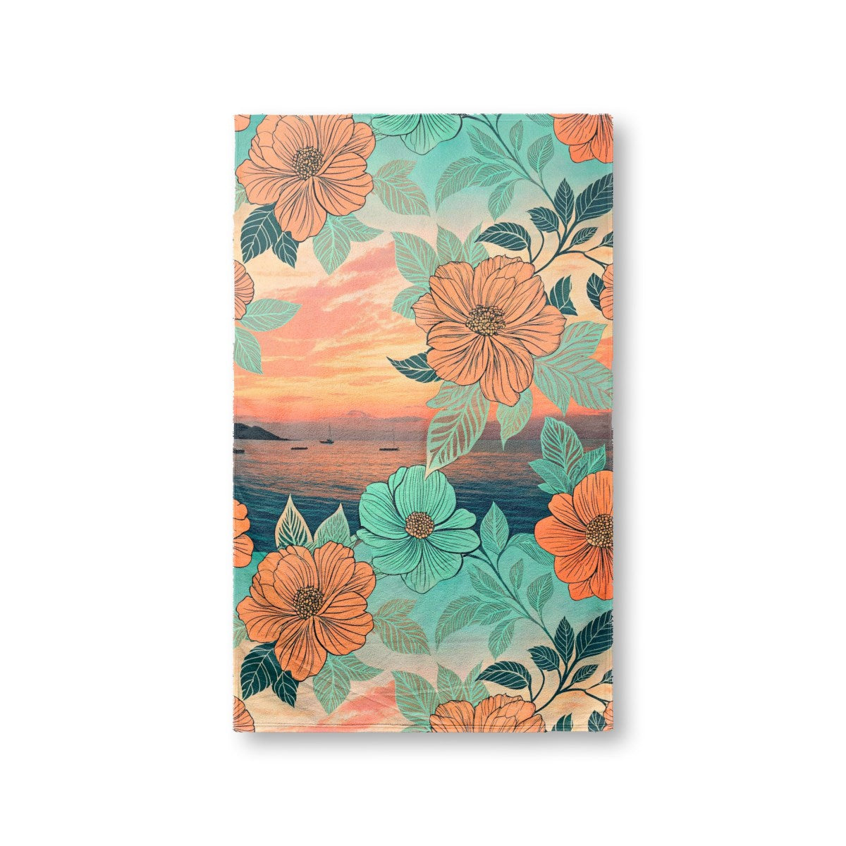 This composite image blends a stylized floral pattern with a realistic ocean sunset. Bold orange and turquoise flowers are overlaid on a serene seascape featuring sailboats and distant islands under a vibrant, cloudy sky, creating a unique artistic collage.