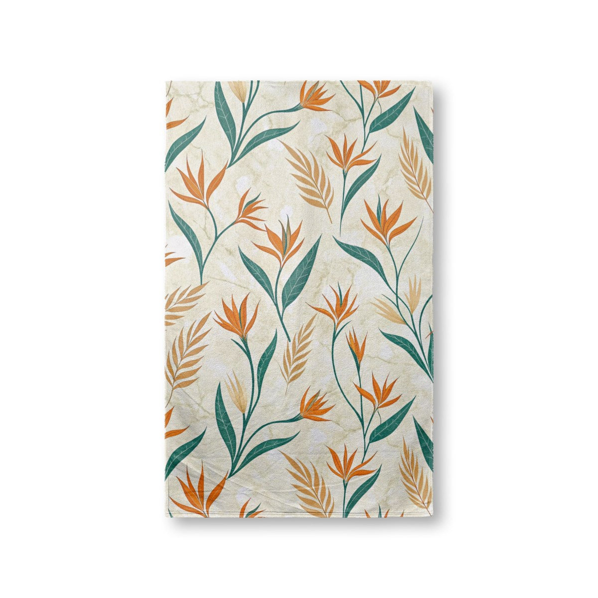 This image displays a seamless botanical pattern featuring stylized Bird of Paradise flowers. The orange, tan, and dark green plants are set against a light, creamy background with a subtle marbled texture, creating an elegant and modern tropical design.