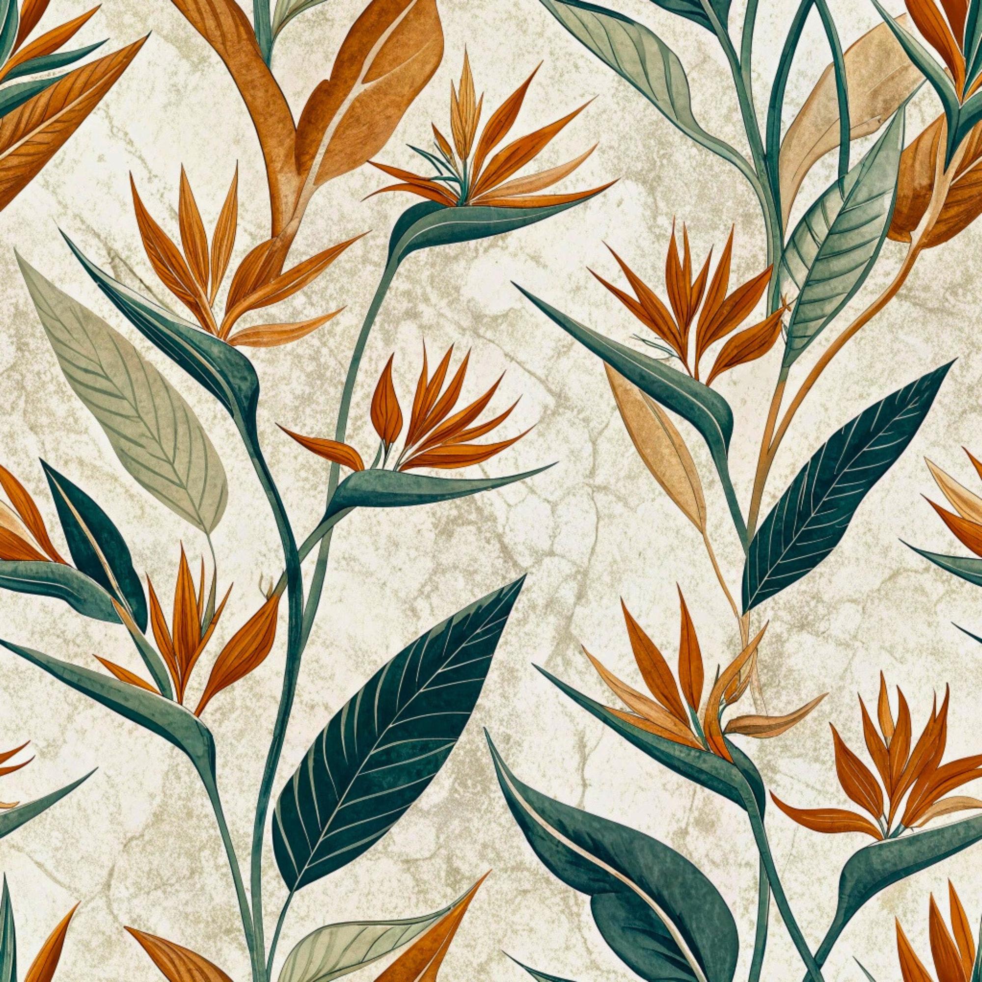 This is a stylized botanical pattern featuring Bird of Paradise flowers and tropical leaves. The design uses a warm, earthy color palette of burnt orange, terracotta, and deep greens, set against a textured, light-beige background with a subtle crackled effect for a vintage feel.