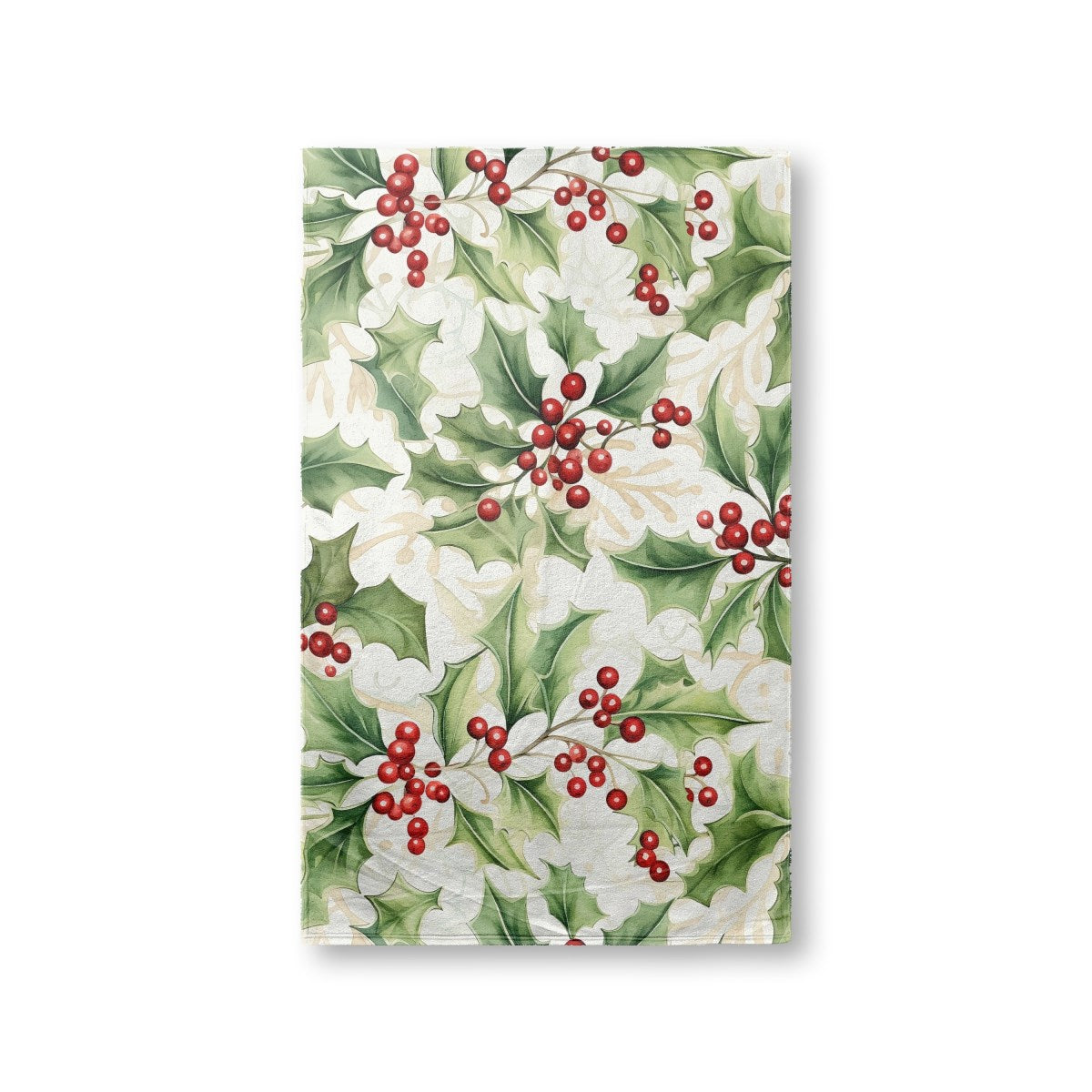 This is a seamless watercolor pattern of festive holly. The design features sprigs with spiky green leaves and clusters of bright red berries, layered over a light background with faint silhouettes of leaves, creating an elegant, classic holiday feel.