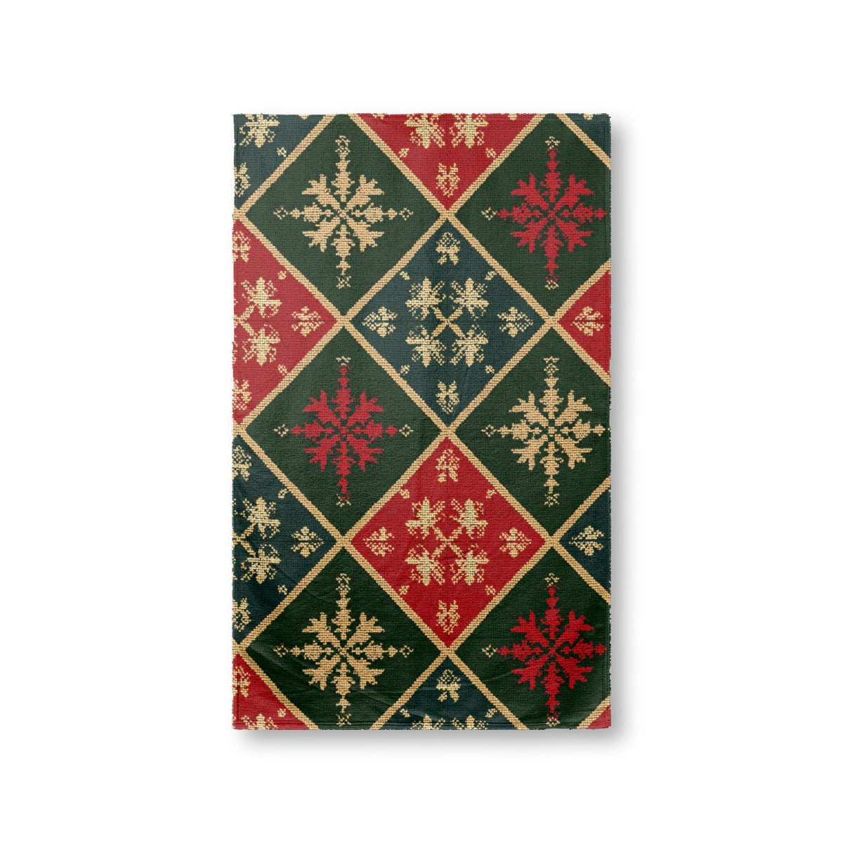 A festive, knitted textile pattern featuring red, green, and dark blue diamonds outlined in gold. Each diamond contains intricate snowflake motifs, evoking the cozy feel of a traditional Christmas sweater or tapestry.