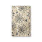 This vintage-style illustration features an intricate, repeating pattern of black spiderwebs on a textured, parchment-like background. Two detailed spiders are present, one crawling on a web and another dangling from a thread, creating a classic spooky or Halloween-themed design.