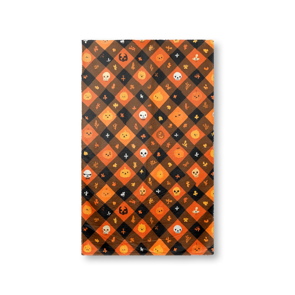 A whimsical, seamless Halloween pattern featuring a diagonal plaid in orange, black, and brown. The design is scattered with hand-drawn, cartoonish skulls, jack-o'-lanterns, and other small autumnal motifs, creating a festive and spooky-cute feel.
