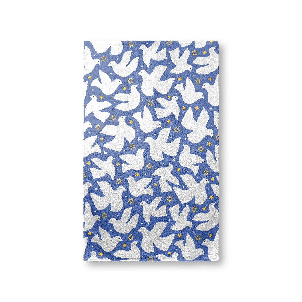 A seamless pattern of stylized white doves flying against a blue background. The design is scattered with yellow Stars of David and smaller stars, creating a symbolic and peaceful motif with Jewish themes.