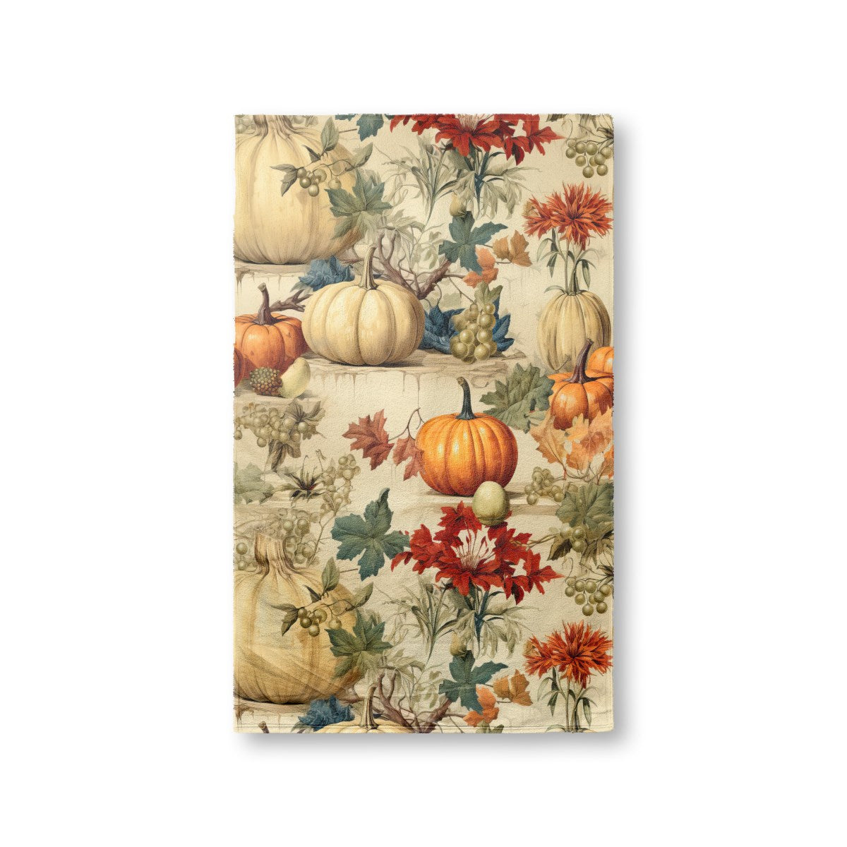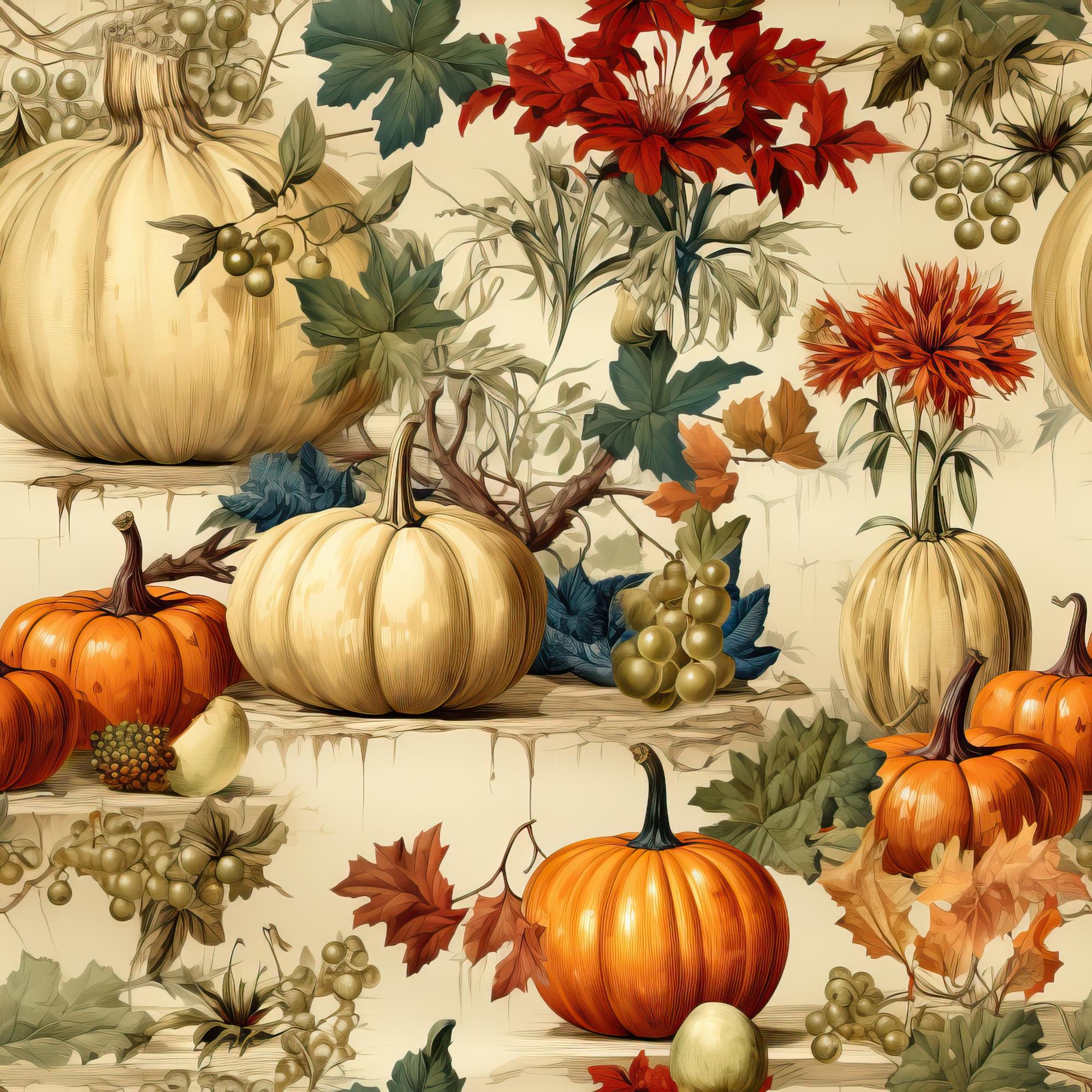 A vintage-style illustration of a bountiful autumn harvest. Orange and pale pumpkins, grapes, and colorful foliage are arranged on tiered stone ledges, creating a rich, decorative pattern with a classic, botanical feel.