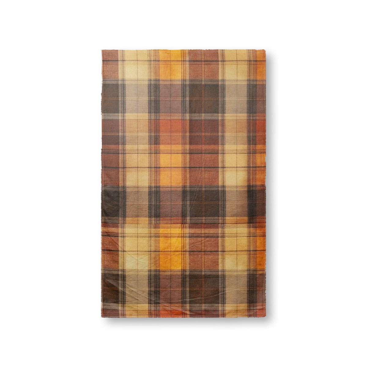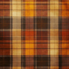 A close-up of a textured plaid fabric in a warm, autumnal color palette. The classic tartan pattern features intersecting stripes of brown, orange, mustard yellow, and beige, creating a cozy and rustic look.