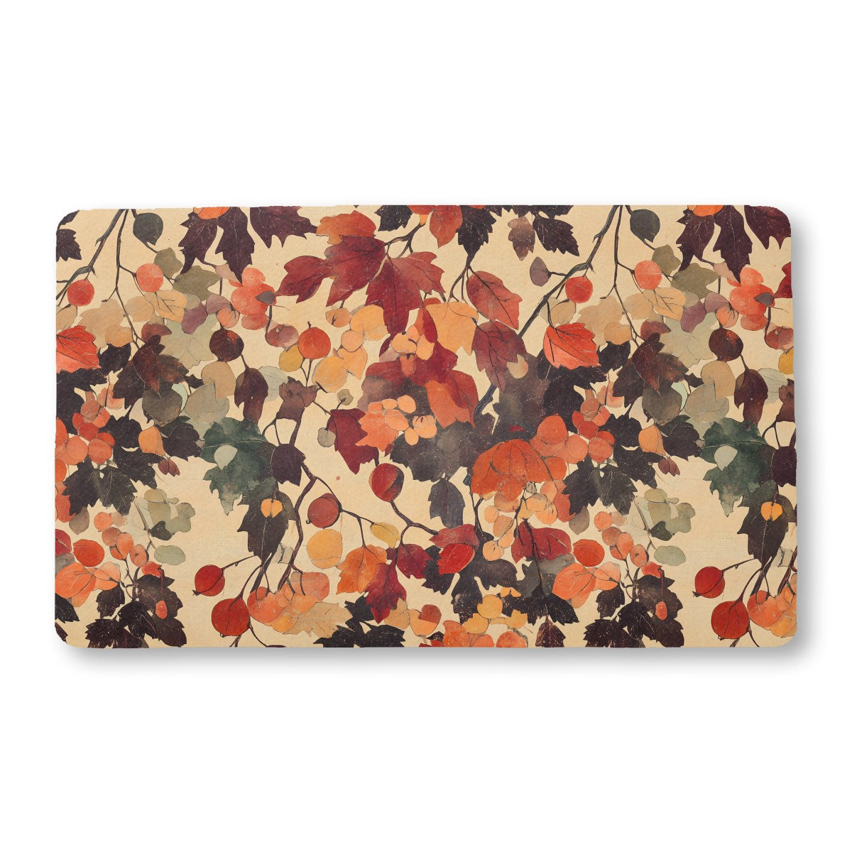 This stylized, artistic pattern features autumnal branches with leaves in rich reds, oranges, and deep purples. Clusters of round berries are scattered throughout the warm-toned foliage, set against a pale, textured background, creating a classic, decorative composition reminiscent of Japanese screen painting.