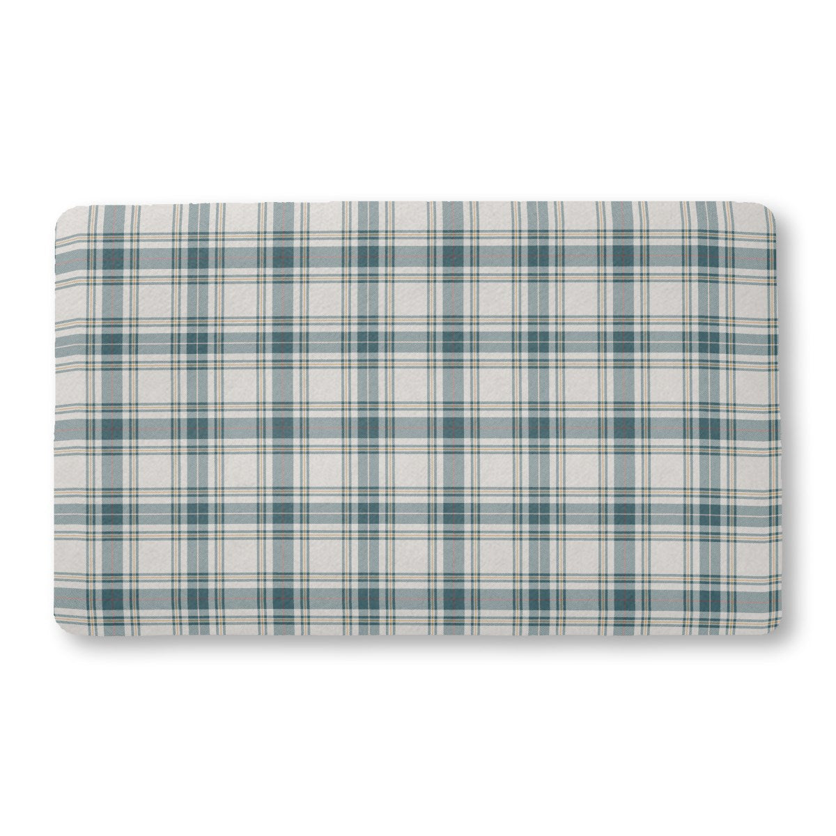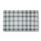 The image shows a seamless pattern of a plaid design. The base is off-white, with intersecting lines of teal, light grey and beige.