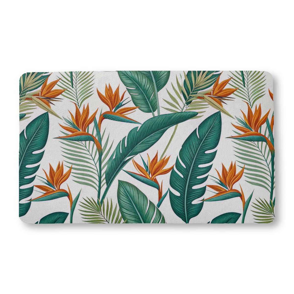 A vibrant, repeating pattern of tropical flora. Striking orange Bird of Paradise flowers bloom amongst lush, deep green palm and banana leaves. The stylized design is set against a clean white background, creating a bold and classic botanical print.