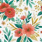 This is a vibrant watercolor floral pattern on a white background. The design features elegant coral-red flowers, teal-green and golden leaves, and delicate gold specks, creating a warm and sophisticated botanical illustration.