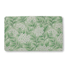 This is a seamless botanical pattern featuring elegant clusters of small white flowers and detailed green leaves. The graceful, curving stems are set against a soft sage green background, creating a classic, vintage-inspired design.