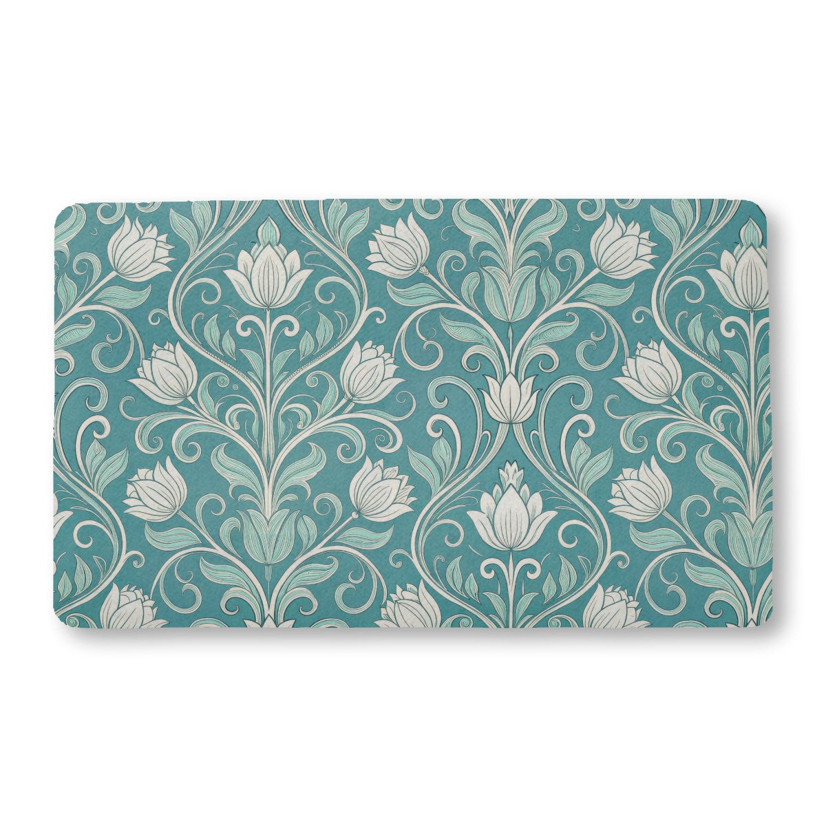 An elegant, symmetrical floral pattern in the Art Nouveau style. Stylized white and mint-green flowers are connected by swirling vines on a rich teal background, creating an intricate and decorative design reminiscent of vintage wallpaper.