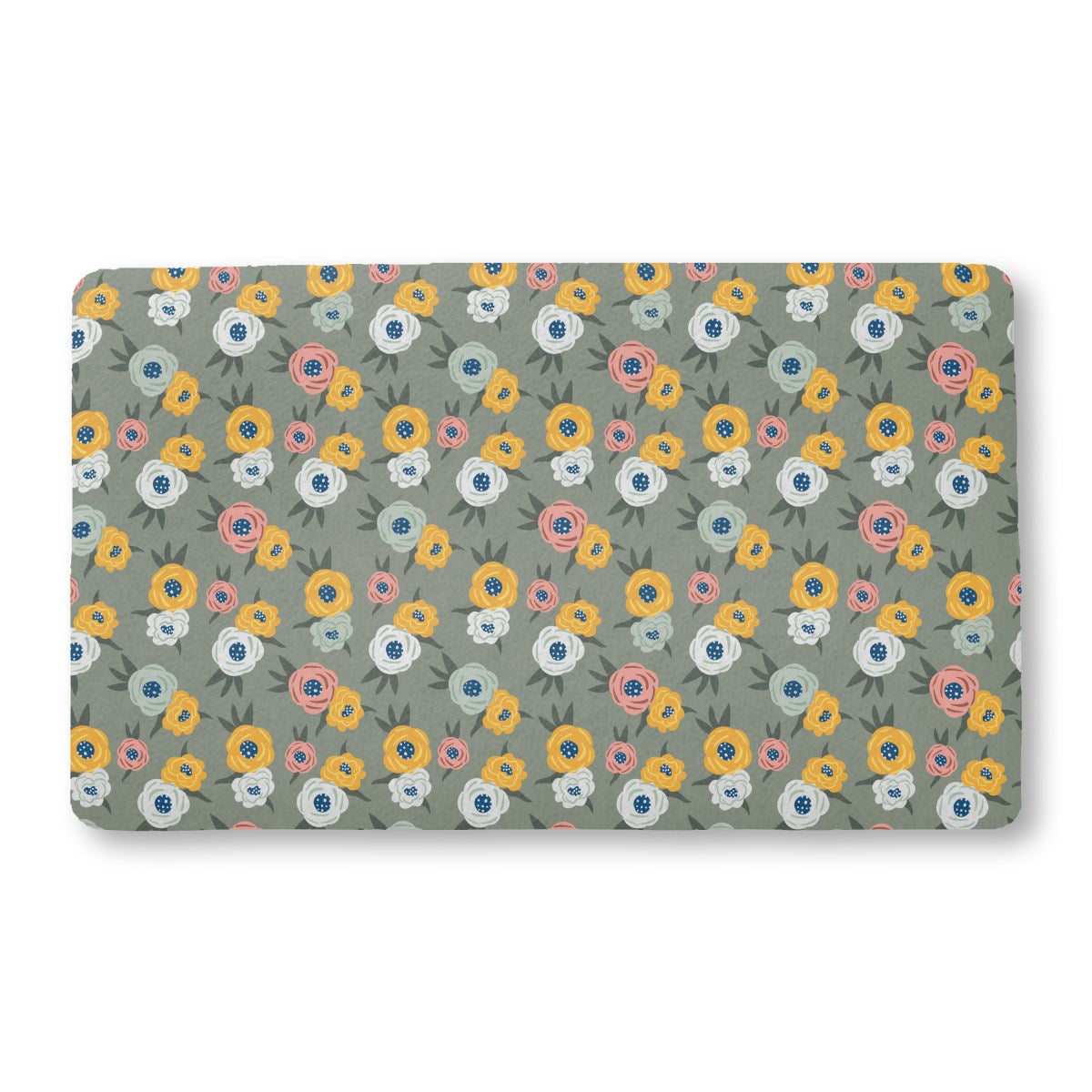 A repeating pattern of stylized flowers in yellow, pink, white, and pale blue on a muted gray-green background. Each flower features a dark blue center with white polka dots, creating a charming and whimsical design with a retro feel.