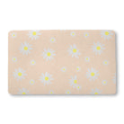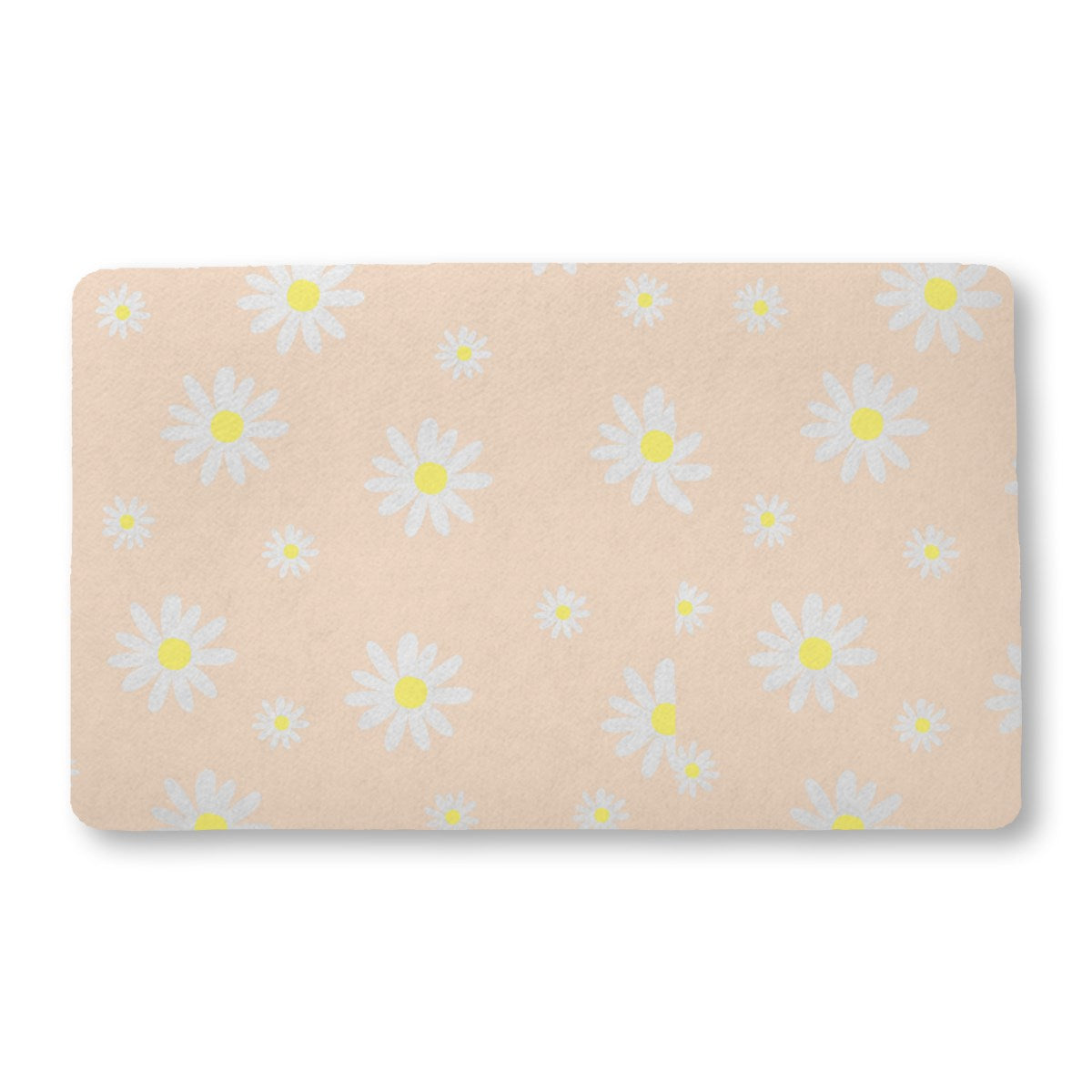 This is a simple, seamless pattern of stylized daisies. White flowers with yellow centers, in various sizes, are scattered across a soft, pale peach background for a sweet and gentle effect.