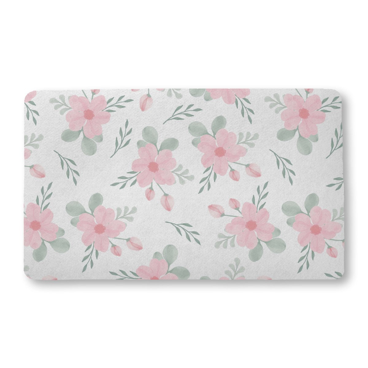 A seamless watercolor pattern featuring delicate pink flowers, buds, and sage green leaves. The gentle floral elements are scattered across a clean white background, creating a soft, elegant, and charming design suitable for textiles or wallpaper.