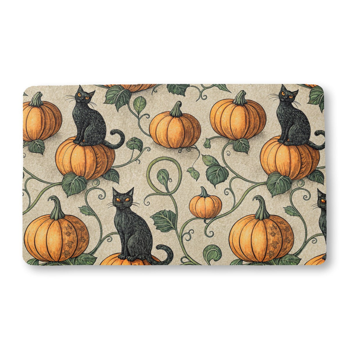 A vintage-style seamless pattern features black cats with glowing orange eyes perched on pumpkins. Swirling green vines and leaves connect the elements on a textured, light background, creating a classic Halloween-themed illustration with a slightly spooky feel.