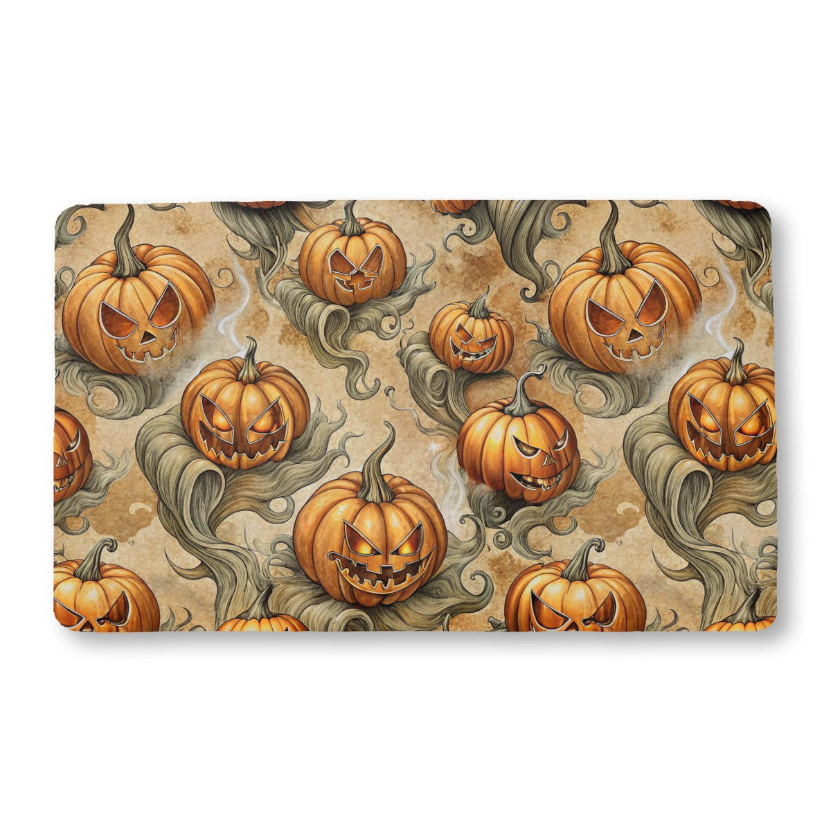 This is a spooky, seamless Halloween pattern of menacing jack-o'-lanterns. Each pumpkin features a unique, glowing, evil face and rests on gnarled, swirling tendrils against a textured, parchment-like background, creating an eerie and festive design.