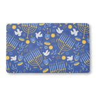 A festive, repeating pattern celebrating Hanukkah on a blue background. The design features illustrations of menorahs, dreidels, sufganiyot (doughnuts), Stars of David, and white doves in a cheerful yellow, blue, and white color palette, creating a joyful holiday theme.