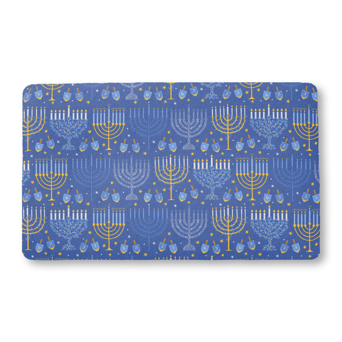 This is a festive, repeating Hanukkah pattern on a blue background. The illustration features various stylized menorahs, dreidels, lit candles, and stars in a cheerful color palette of blue, yellow, and white, celebrating the Jewish holiday.