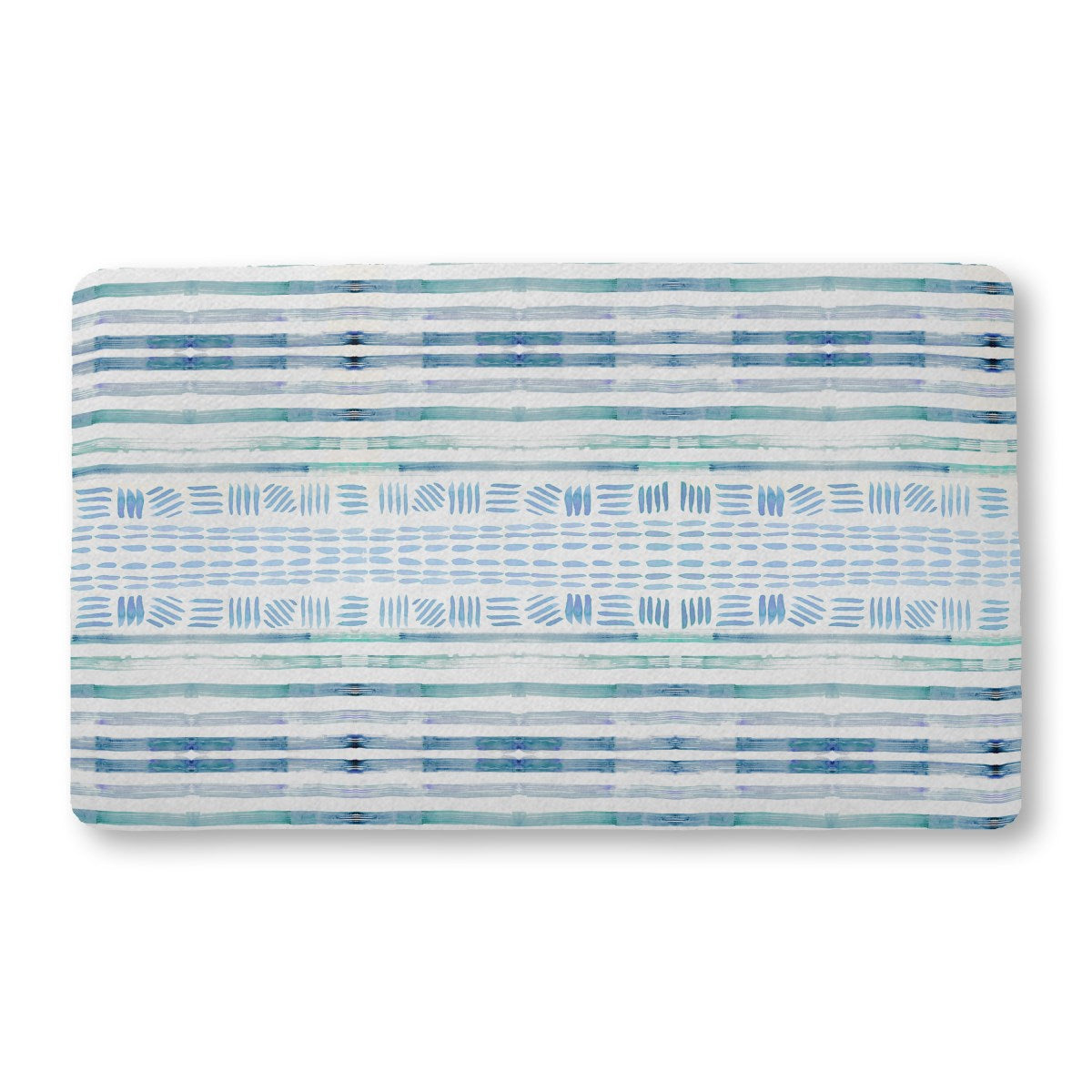 The image is a watercolor painting featuring a repeating pattern. The main design consists of broad horizontal stripes in varying shades of blue and teal, interspersed with thinner stripes of white. A central band displays a more intricate pattern of smaller, stylized shapes, including dashes, dots and small oblong forms, also in varying shades of blue. The overall effect is a harmonious blend of simple stripes and a more textured, almost tribal-inspired pattern. The color palette is cool and calming, emphasizing shades of blue and teal against a white background. The pattern is symmetrical, reflecting across both the horizontal and vertical axes.