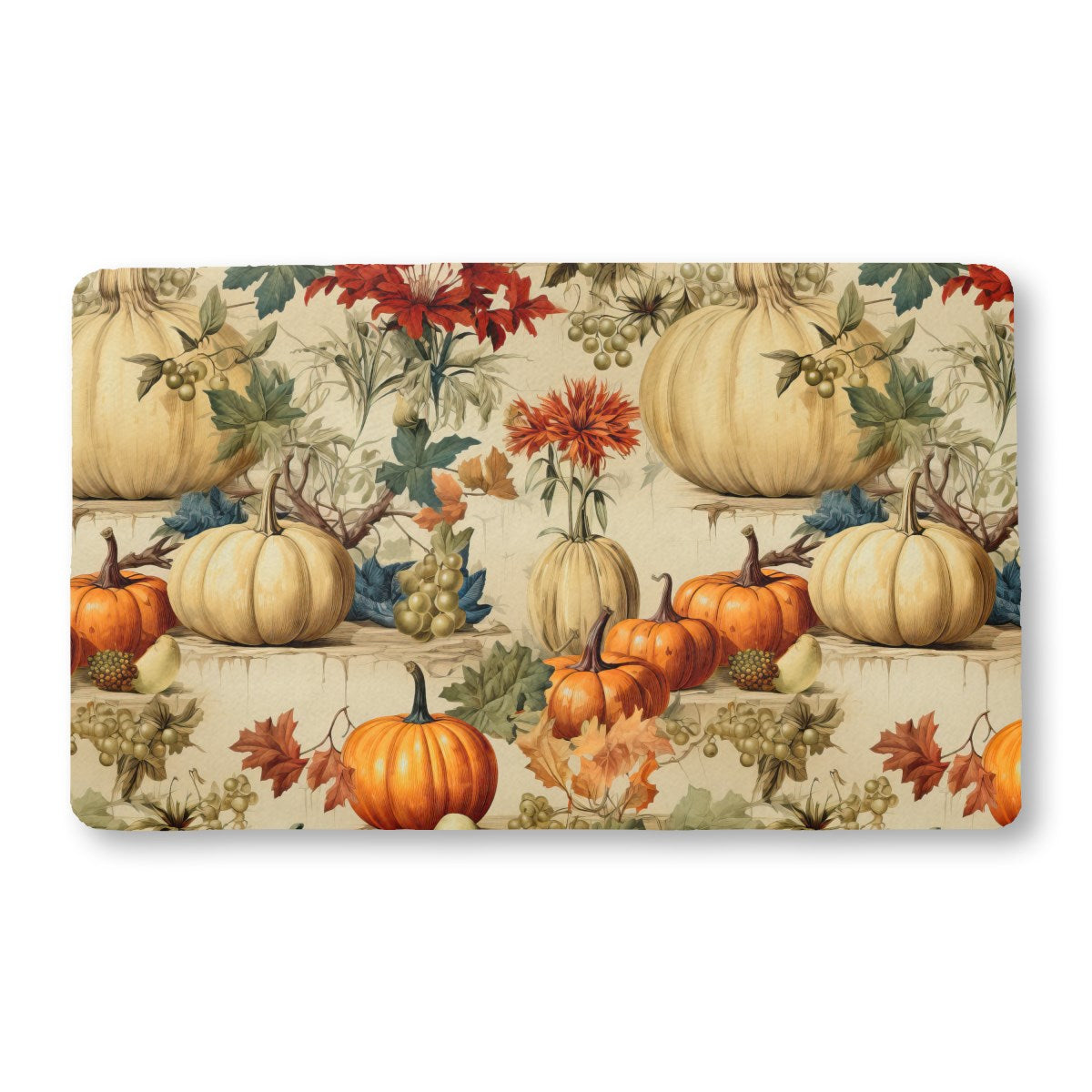 A vintage-style illustration of a bountiful autumn harvest. Orange and pale pumpkins, grapes, and colorful foliage are arranged on tiered stone ledges, creating a rich, decorative pattern with a classic, botanical feel.