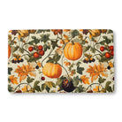 A vintage-style pattern illustrates a bountiful autumn harvest. Orange pumpkins, mottled gourds, grapes, and berries are interwoven with colorful fall leaves and twisting vines against a cream background, evoking a sense of seasonal abundance.