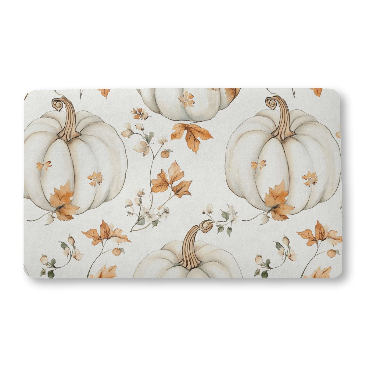 This is a delicate watercolor pattern featuring elegant white pumpkins. The design is interspersed with rustic brown autumn leaves, small white flowers, and trailing vines on a clean background, creating a soft and sophisticated fall aesthetic.