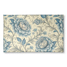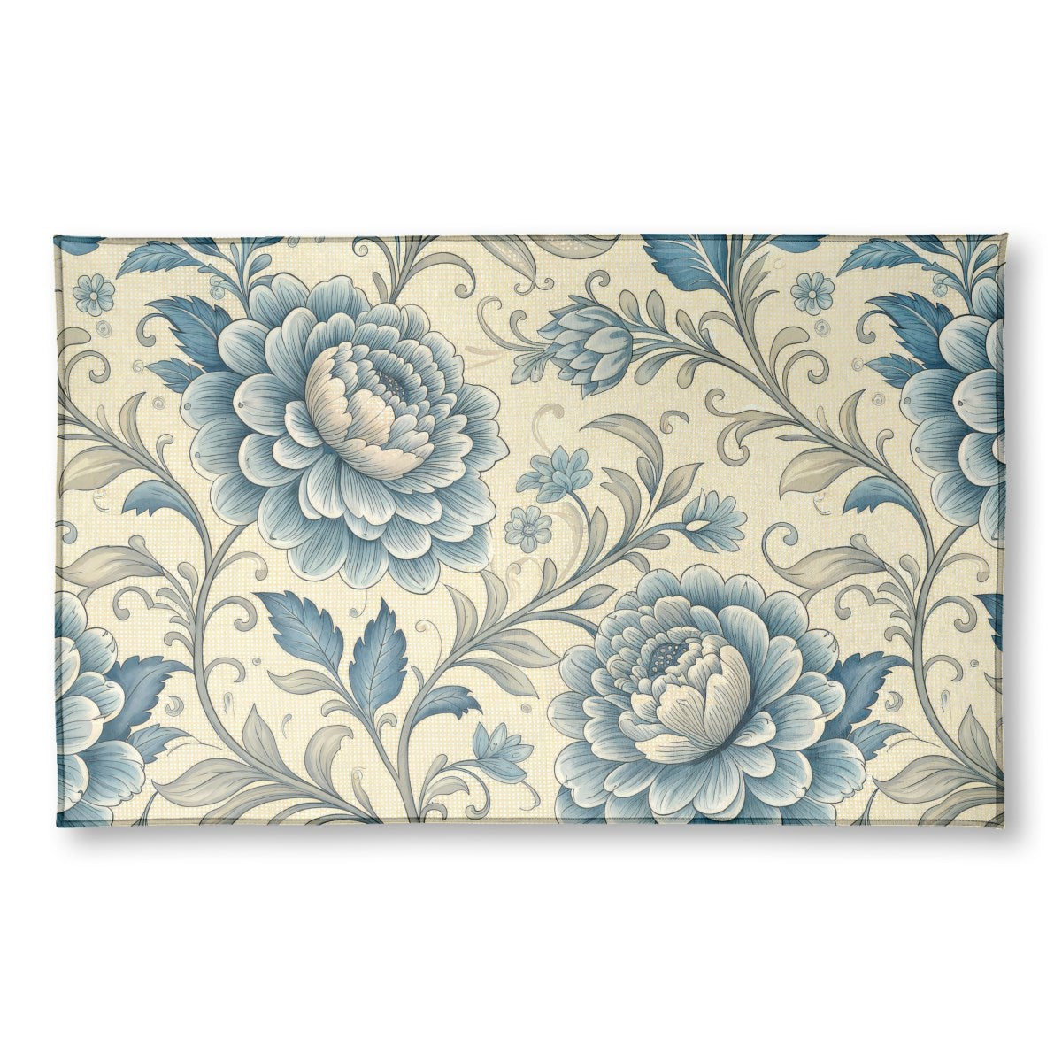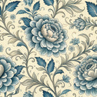 An elegant, traditional floral pattern featuring large, detailed blue and cream peonies. The flowers are interwoven with scrolling grey and blue vines on a dotted, pale yellow background, creating a sophisticated, vintage-inspired design suitable for textiles or wallpaper.