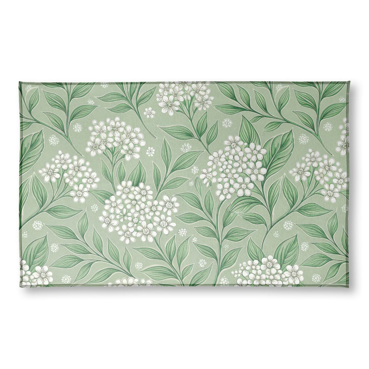 This is a seamless botanical pattern featuring elegant clusters of small white flowers and detailed green leaves. The graceful, curving stems are set against a soft sage green background, creating a classic, vintage-inspired design.