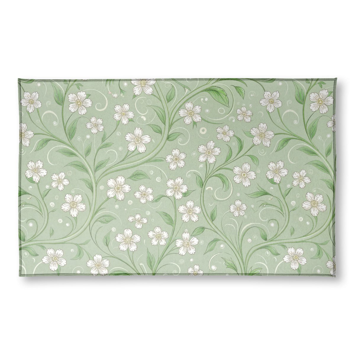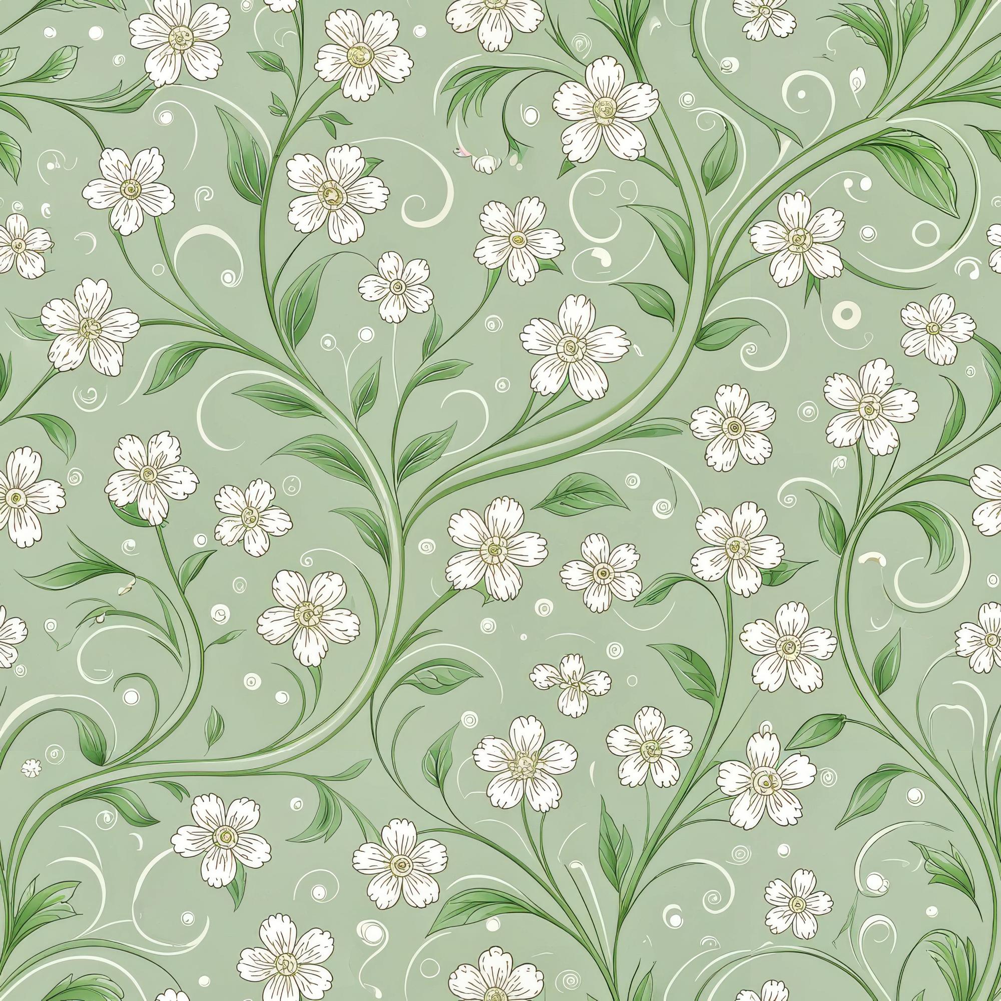 A vintage-style seamless pattern featuring delicate white flowers on gracefully swirling green vines. The intricate, elegant design is set against a soft, muted sage green background with subtle decorative swirls, creating a classic and serene composition.